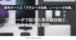 都市ボーイズは、思い込みが身体に与える影響の方向性として、良い方向に働くプラシーボだけでなく、悪い方向に働くノーシーボも含めて語り、話を次の回(投稿体験談)へつなぐ。